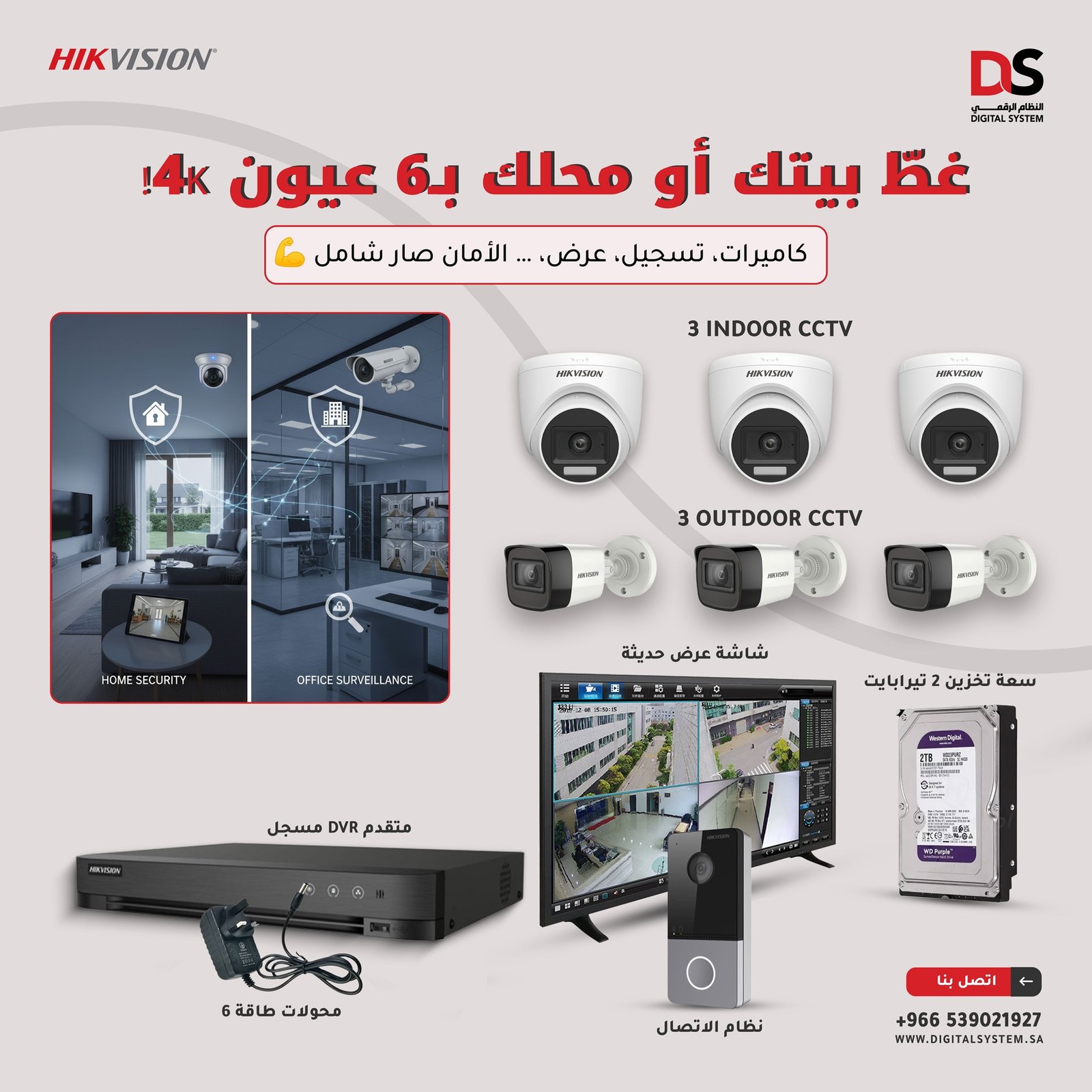 غطِّ بيتك أو محلك مع باقة المراقبة بدقة 4K من هيكفيجن بـ 6 كاميرات عالية الدقة. يشمل النظام: