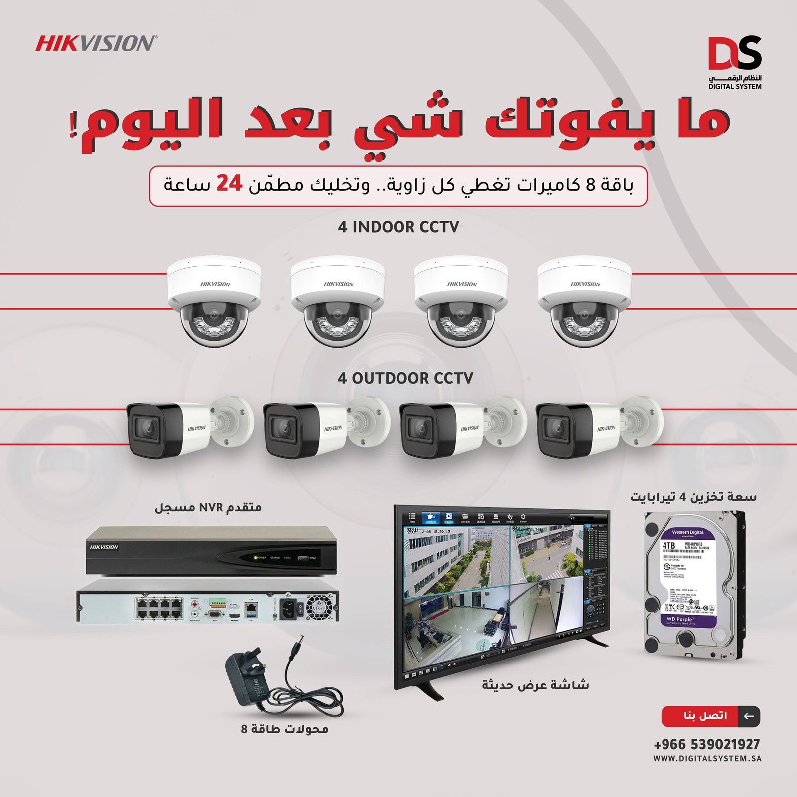 لا يفوتك شيء بعد اليوم مع باقة المراقبة الشاملة من هيكفيجن بنظام IP بـ 8 كاميرات عالية الدقة. يشمل النظام: